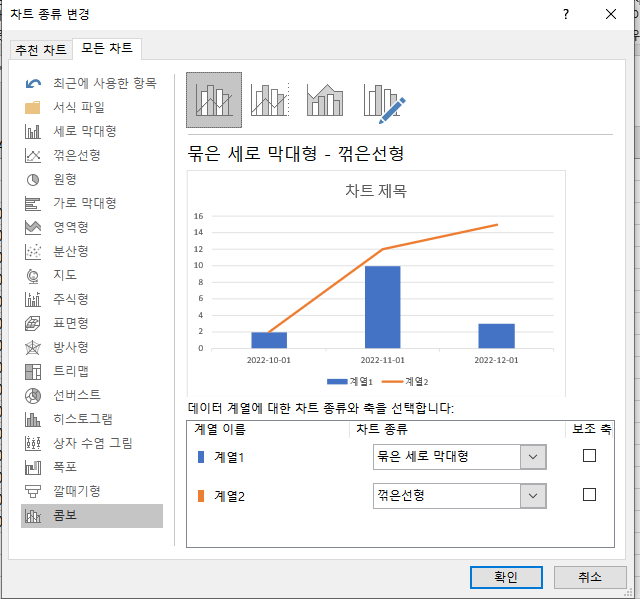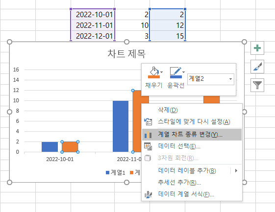 표에서 누적데이터를 선택하고, 계열 차트 종류 변경을 클릭해 줍니다.