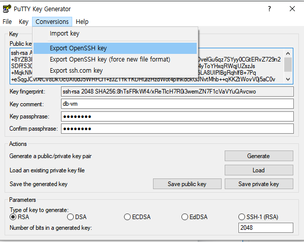 이 후에 conversions -> Export Openssh key를 통해서 key파일로 변경합니다.