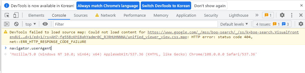 Console 메뉴 하단에 navigator.userAgent라고 명령어를 치시면