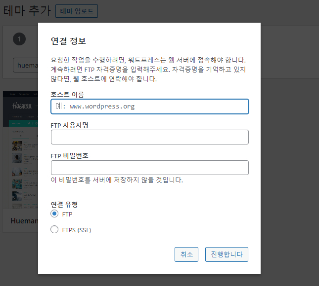 워드프레스 최초 설치 후 테마를 설치하고자 하면 FTP 요청이 발생합니다.