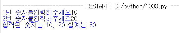 print(f'입력된 숫자는 {a}, {b} 합계는 {a+b}')