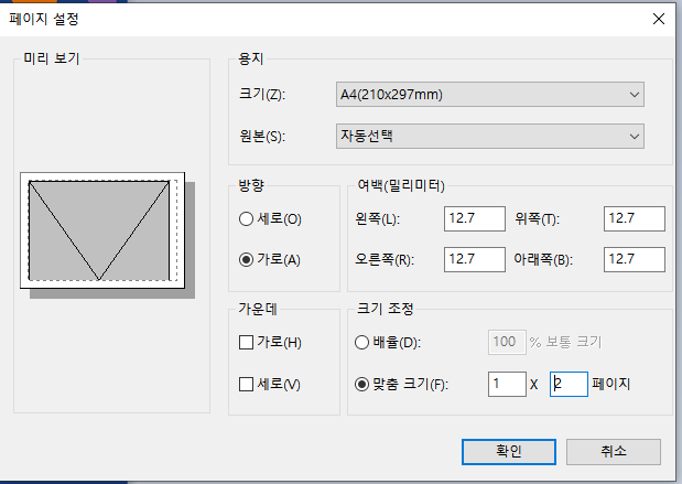 이 때 맞춤 크기에서 아래처럼 2장으로 뽑기를 하면