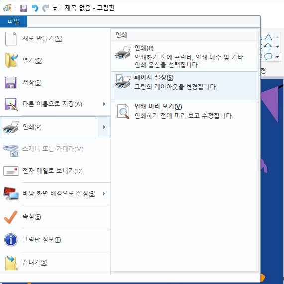 이때 그림판 - 인쇄 - 페이지설정에 가시면 페이지 출력을 설정할 수 있는데요.