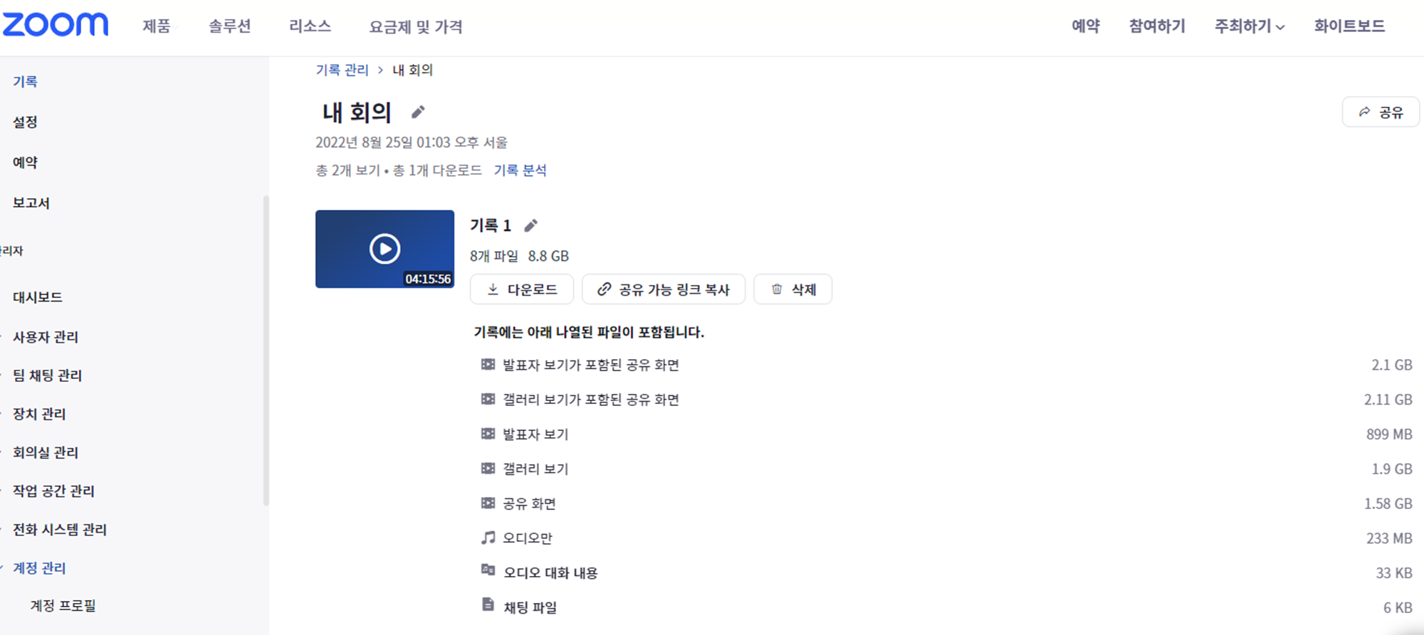 이때 Zoom에서 사용가능한 용량은 계정관리 - 기록관리에 들어가시면 기록 용량을 확인할 수 있는데요.