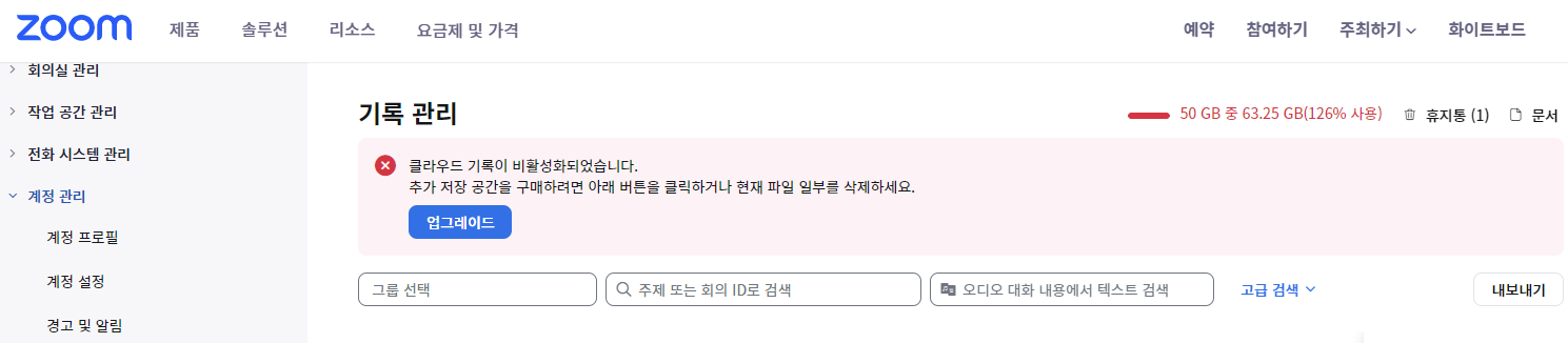 줌을 사용중에 클라우드 저장 공간이 꽉 찼다는 알림을 받았는데요.
