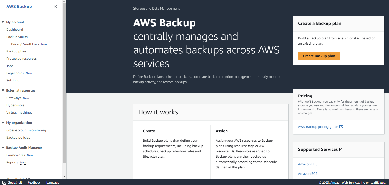AWS 홈에서 AWS Backup페이지로 이동합니다.