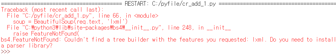 | ======================================== RESTART: C:/pyfile/cr_add_1.py ======================================= Traceback (most recent call last): File "C:/pyfile/cr_add_1.py", line 1, in <module> import feedparser ModuleNotFoundError: No module named 'feedparser' >>> ======================================== RESTART: C:/pyfile/cr_add_1.py ======================================= Traceback (most recent call last): File "C:/pyfile/cr_add_1.py", line 66, in <module> soup = BeautifulSoup(req.text, 'lxml') File "C:\python3\lib\site-packages\bs4\__init__.py", line 248, in __init__ raise FeatureNotFound( bs4.FeatureNotFound: Couldn't find a tree builder with the features you requested: lxml. Do you need to install a parser library? |