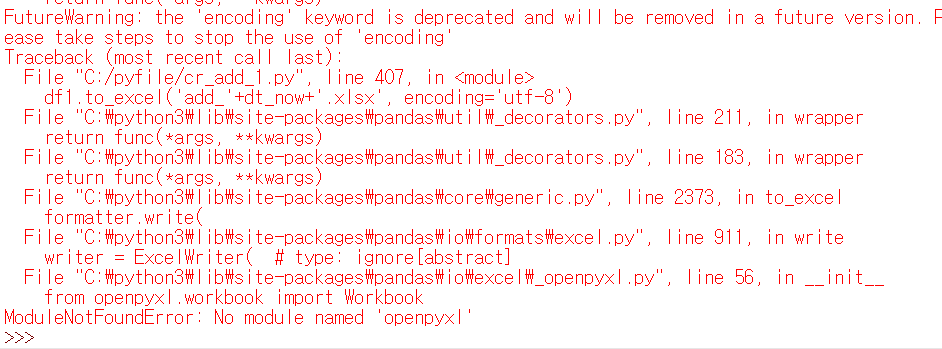 아래의 경우에도 openpyxl 패키지를 설치하면 에러를 없앨 수 있습니다.