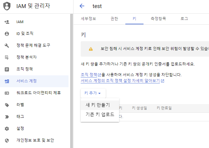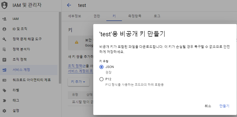 이후 키가 만들어지면 Json 다운로드를 통해 키를 다운로드 받습니다.
