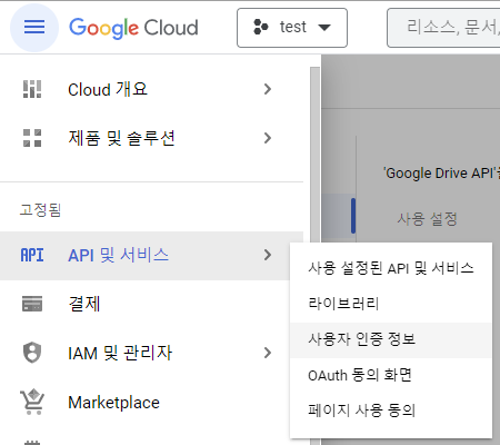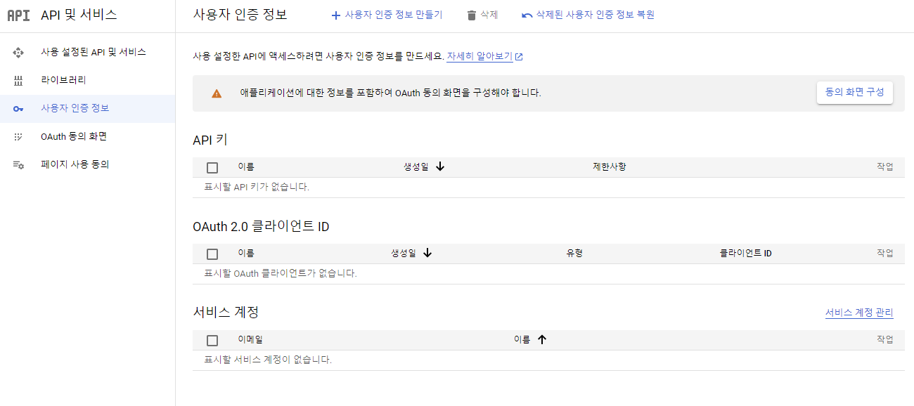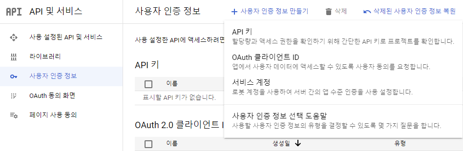 이 후 가로 세줄 더보기 - API 및 서비스 - 사용자 인증정보 메뉴로 들어갑니다.