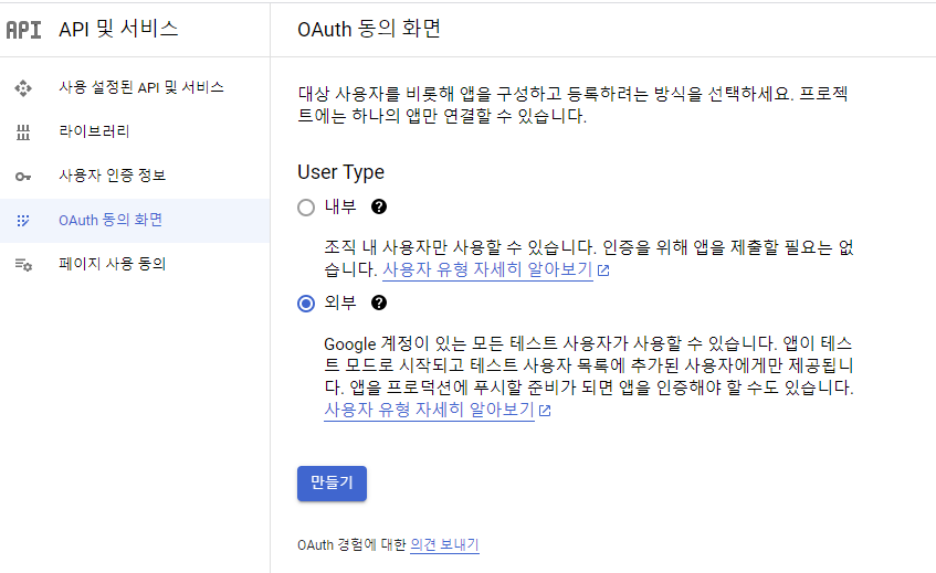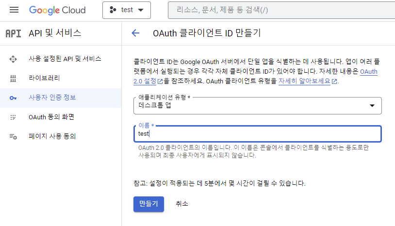 다시 돌아와 사용자 인증 정보 - 사용자 인증 정보 만들기 - OAuth 클라이언트 ID를 선택합니다.