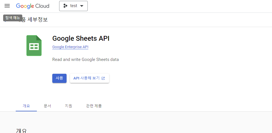 필요시 Google sheets API 등 여러 API를 사용을 눌러서 활성화할 수 있습니다.