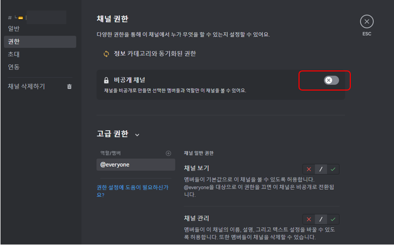 이러한 비공개 채널은 채널 생성시 선택할 수 있는데요. 해당 기능을 활성화 해야지 서버에서 비공개 채널을 사용할 수 있습니다. 해당 기능을 활성화하지 않으면 비공개 채널 운영이 불가능합니다.