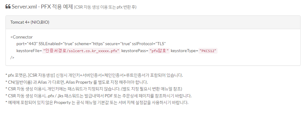 기본적으로 Tomcat의 경우 JavaKeyStore 또는 PFX파일을 사용하여 SSL을 적용합니다. 아래 사이트에서 워낙 자세하게 SSL 인증서 적용방법을 적어 놓았는데요.